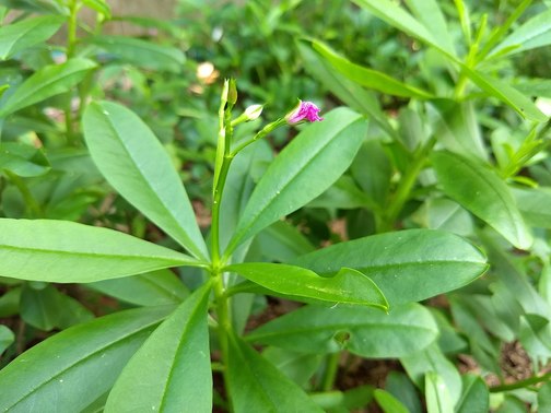 As folhas são lisas e suculentas, dispostas em espiral cruzada. Flor pequena, cor rosa, bissexuada, actinomorfa, inflorescência axilar ou terminal.