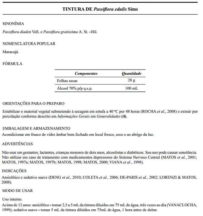 - Formulário de Fitoterápicos da Farmacopeia Brasileira. ANVISA, 1ª ed., p. 45,46,47, 88. 2011.